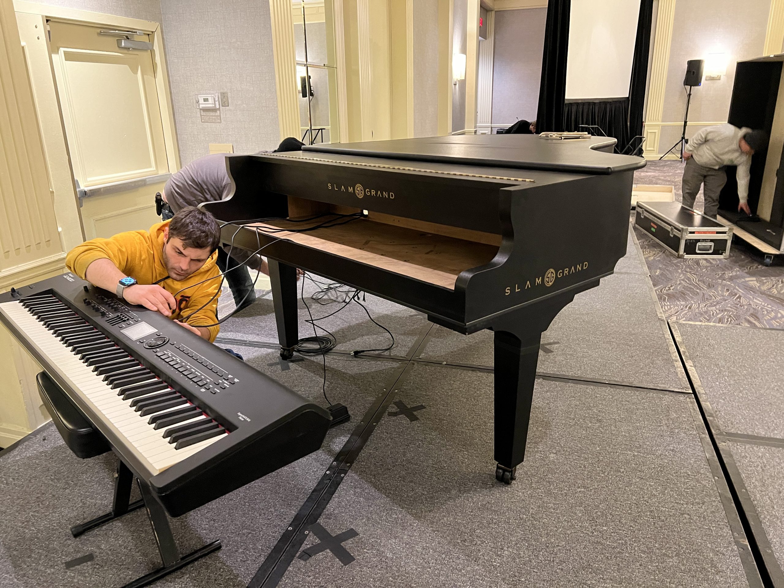 It might surprise you to learn that what the audience believes to be a real piano is actually just a piano “shell.” A piece of “furniture” designed to look like a piano, and it contains an electric keyboard; which connects to the audio board. The whole setup weighs about 150lbs and can be easily delivered, setup, and removed—virtually anywhere—by vendors we partner with in cities around the world.